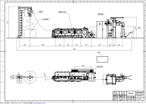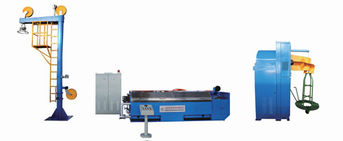 机组构成 本机组主要由龙门式放线架、大拉机主机、JY-750型梅花落线机(或双盘收线机)、电控系统和冷却润滑系统等部分组成,并附有轧头穿模机相配套,组成整套机组