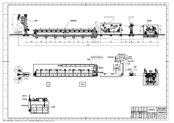 机组常规组成: 设备由放线架,轧头穿模机,拉线主机,张力控制系统,储线装置,Φ630~Φ710收线机,拉线油供油系统及冷却系统,电气控制系统。 机组整体布局示意图
